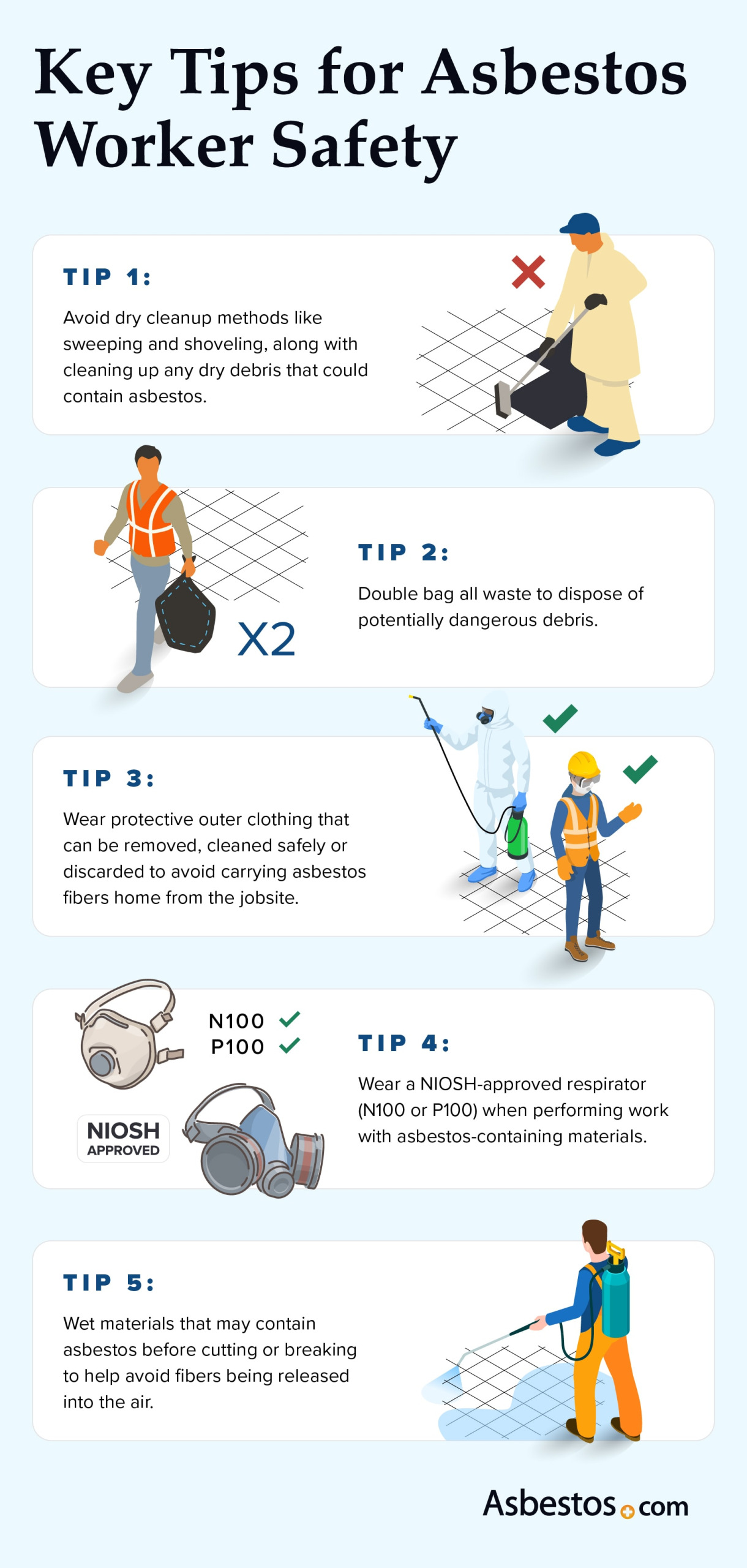 Tip 4: Wear a NIOSH-approved respirator (N100 or P100) when performing work with asbestos-containing materials.
