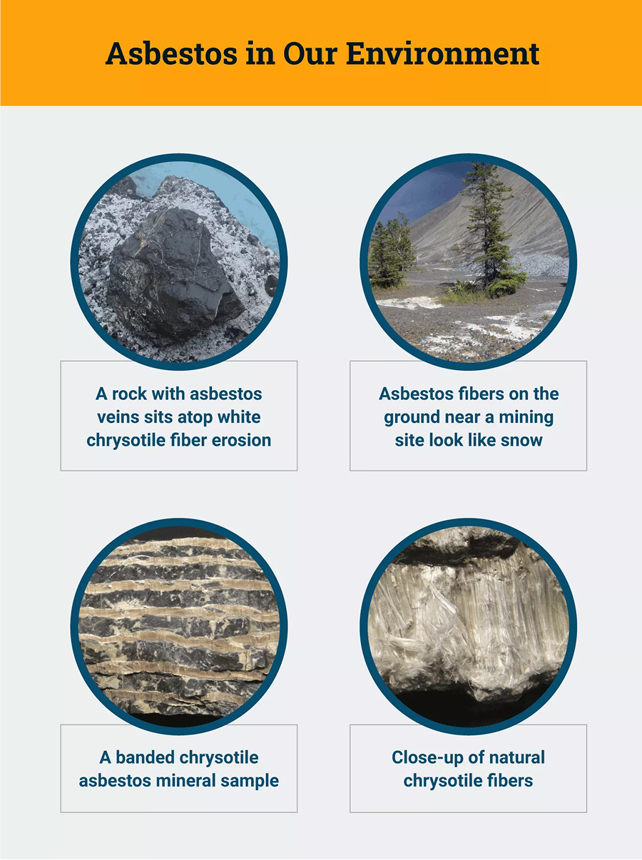 Asbestos in the environment is mostly found near mountainous regions. Natural asbestos deposits and old mining sites present a serious risk of exposure.