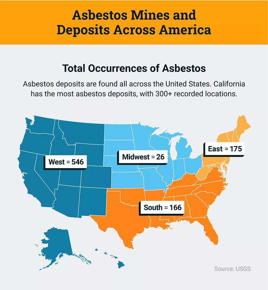 Naturally occurring asbestos deposits are in many areas of the United States. Mountainous regions have the most deposits. The Western U.S. was home to mining operations in California, Montana, Nevada, Wyoming, Idaho and Washington. The U.S. Geological Survey has created an interactive map you can use to see if there are natural asbestos deposits near you.