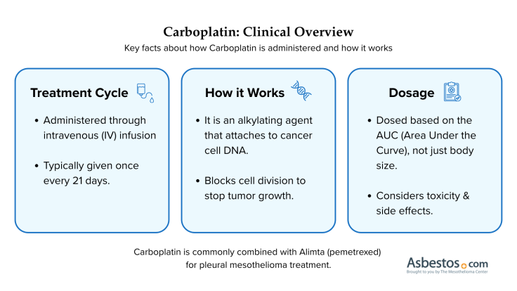 Carboplatin is a chemotherapy drug that can help treat certain types of cancer, such as head and neck, ovarian and lung cancers. It also treats mesothelioma, a rare cancer primarily caused by asbestos exposure. Carboplatin enters cancer cells and attaches itself to DNA. This action blocks the cell from dividing or working properly. It stops the cell from growing and eventually kills it.