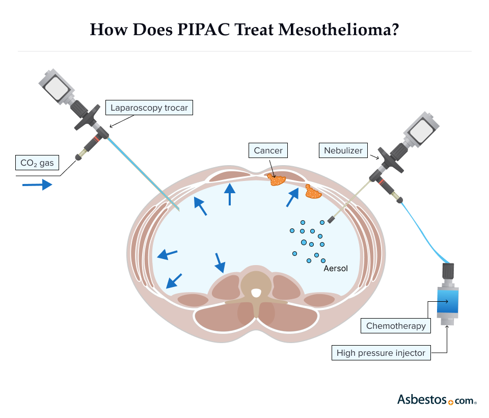 PIPAC for mesothelioma uses a special delivery method to treat the cancer. First, the chemo is placed directly into the abdomen. Second, a pressurized aerosol mist helps the mesothelioma chemotherapy reach more of the cancer cells.